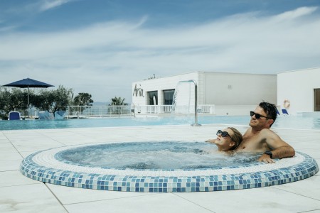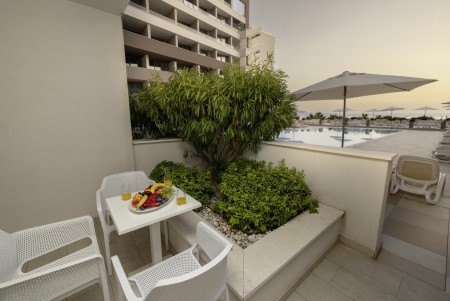 Royal Appartement mit privatem Pool für 2-4 Personen: ca. 50 m², mit Schafzimmer mit Doppelbett (210x200 cm), Wohnbereich mit Schlafsofa (160x220 cm) für einen Erwachsenen oder bis zu zwei Kinder, voll ausgestattete Küche mit Kochfeld, Toaster, Wasserkocher, Kaffeemaschine, Mikrowelle, Kühlschrank, Esstisch, LCD-SAT-TV, Telefon, Safe, Wäscheständer, Badezimmer mit begehbarer Dusche und WC, möblierte Terrasse und privatem Pool (2,50 x 5 m, 1,30 m tief). Wahlweise buchbar zur Park- oder Meerseite.