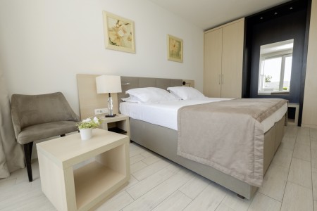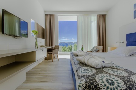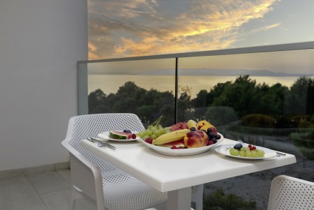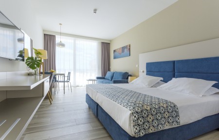 Superior Appartement für 2-4 Personen: ca. 50 m², Schafzimmer mit Doppelbett (210x200 cm), Wohnbereich mit Schlafsofa (160x220 cm) für einen Erwachsenen oder bis zu zwei Kinder, voll ausgestattete Küche mit Kochfeld, Toaster, Wasserkocher, Kaffeemaschine, Mikrowelle, Kühlschrank, Esstisch, LCD-SAT-TV, Telefon, Safe, Wäscheständer, Badezimmer mit begehbarer Dusche und WC, möblierter Balkon. Wahlweise buchbar mit eingeschränkten oder direktem Meerblick.
