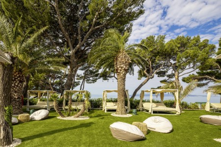 Strand: Zum langen Kiesstrand mit schattenspendenden Pinien, Liegestuhl- und Sonnenschirmverleih sind es nur 20 m über die Uferpromenade.