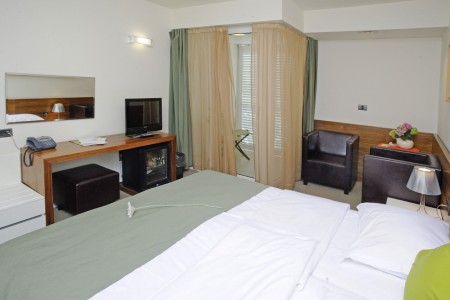 13 Zimmer: ca. 22 m², modern und komfortabel eingerichtet, mit SAT-TV, Klimaanlage, Telefon, WiFi-Internet (kostenlos), Minibar, Safe, Bad/WC und Balkon zur Meerseite.