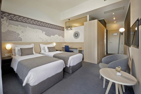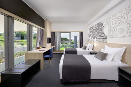 Superior Dreibettzimmer: ca. 32 m², mit drei Einzelbetten und Blick auf den Pool bzw. Park.