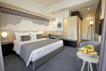47 Zimmer: Luxuriös, modern und geschmackvoll eingerichtet bieten alle Zimmer und Suiten Klimaanlage, Telefon, WiFi-Internet (kostenlos), LED SAT-TV, Minibar, Safe, Schreibtisch, Bad oder Dusche/WC, Haarföhn sowie schallisolierte Fenster. Bademantel und Hausschuhe vorhanden. Kinder-Babybetten sind auf Anfrage (gegen Gebühr, 15 € pro Tag) erhältlich.
