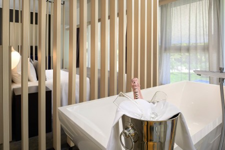 Luxury Cesar Suite: ca. 39 m², ein Doppelzimmer mit Pool- bzw. Parkblick. Das Badezimmer ist ausgestattet mit zwei Waschbecken und einer Duschkabine, während die Badewanne im Schlafzimmer so integriert ist, dass Sie bei einem entspannenden heißen Bad den Ausblick nach draußen genießen können.