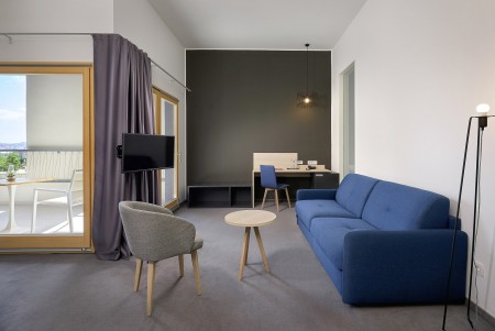 Junior Cesar Suite: ca. 45 m², ein Doppelzimmer mit Balkon und Pool- bzw. Parkblick und ein Wohn-/Schlafbereich mit zwei Einzelbetten und Schreibtisch. Das modern eingerichtete Bad verfügt über zwei Waschbecken, Duschkabine und Badewanne.
