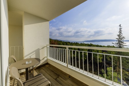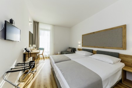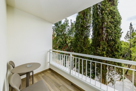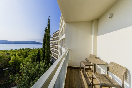 Doppelzimmer Typ A: ca. 21 m², liegen im Gebäudeteil A, mit Balkon zur Parkseite. Auch buchbar in den oberen Stockwerken mit Balkon zur Meerseite.