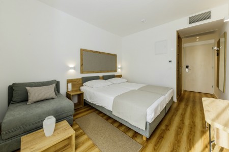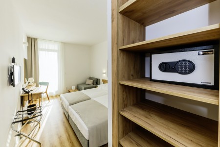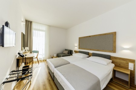 Familienzimmer Typ A: ca. 35 m², im Gebäudeteil A gelegen, Doppelzimmer und Wohnraum mit Schlafcouch (160x190 cm), Balkon zur Meerseite.