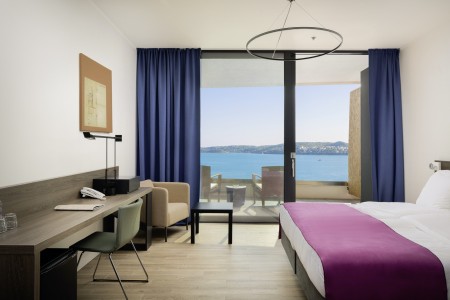 Doppelzimmer Superior Plus: ca. 37 m², Doppelbett oder zwei Betten, en-suite Badewanne, Balkon mit ca. 4 m² und seitlichem Meerblick.