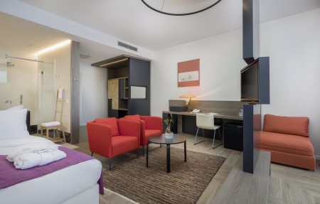 50 Zimmer: Die modern und mit Designermöbel eingerichteten Zimmer sind ausgestattet mit individuell regulierbarer Klimaanlage, Schreibtisch, Safe, Telefon, LCD-TV, Radio, kostenlosem WiFi-Internet, offenem Badezimmer mit Fußbodenheizung und Dusche/WC, Bademantel, Hausschuhen und Föhn sowie Balkon mit seitlichem oder direktem Meerblick. Minibar im Zimmer auf Anfrage und gegen Aufpreis möglich.