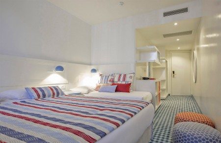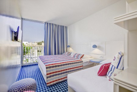 Familienzimmer: ca. 20-28 m², ein Doppelbett oder zwei Einzelbetten und zusätzliches Etagenbett für zwei Kinder bis 11,99 Jahre. Wahlweise auch buchbar mit Balkon.