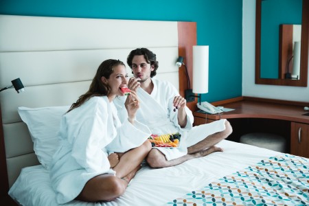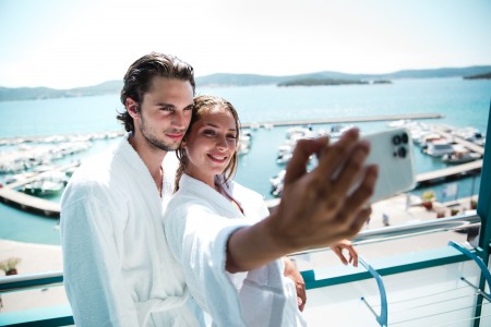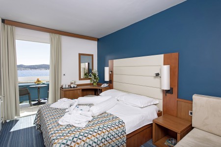 Premium Zimmer: ca. 21 m², Balkon mit Meerblick. Diese Zimmer bieten zusätzlich Bademäntel und Hausschuhe sowie Kaffee-/Teekocher, außerdem tägliche Befüllung der Minibar mit kostenlosen Erfrischungsgetränken.
