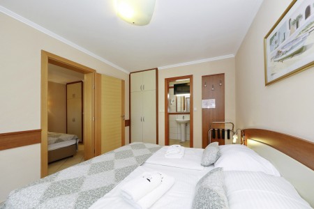 Familiensuite: ca. 29 m², bestehen aus zwei Schlafzimmern, davon eines mit Doppelbett (160x200 cm), Einzelbett und ausziehbarem Einzelbett (je 80x200 cm), das zweite mit einem Einzelbett und ausziebarem Einzelbett (je 80x200 cm), gemeinsames Badezimmer mit Badewanne/WC.