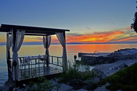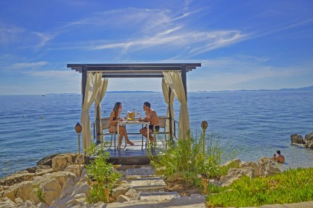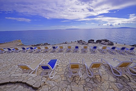 Strand: Der hoteleigene Fels- und Kiesstrand mit betonierten Liegeflächen und Liegestuhl- und Sonnenschirmverleih liegt direkt unterhalb des Hotels.