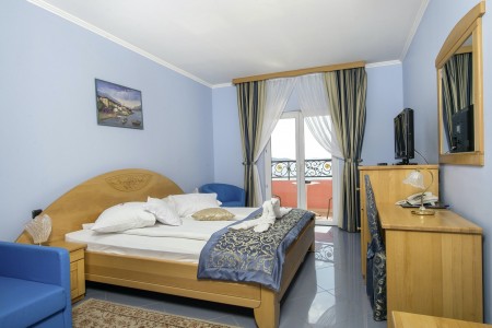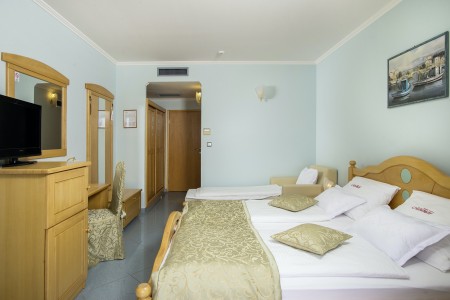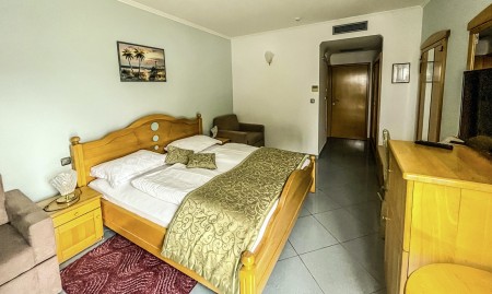 61 Zimmer: ca. 28-32 m², elegant und komfortabel eingerichtet verfügen über Klimaanlage, Telefon, WiFi-Internet (kostenlos), LCD-SAT-TV, Safe, Föhn, Minibar sowie Dusche/WC und Balkon. Gitterbett nach Anmeldung (gegen Gebühr, 12 € pro Tag) möglich. Wahlweise buchbar zur Parkseite mit 2 Schlafsessel (je 180x90 xm) oder Meerseite mit 1 Schlafsessel (180x90 xm).