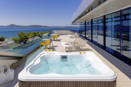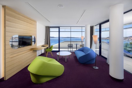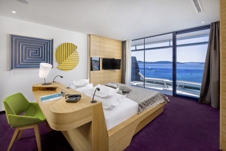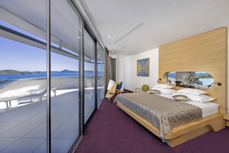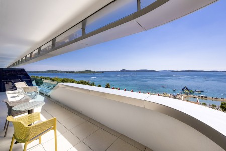 Premium Suite: ca. 75-85 m², Schlafzimmer mit Doppelbett, Wohnzimmer mit Schlafcouch (160x200 cm) für zwei Kinder oder einen Erwachsenen, Bad/WC, Balkon mit Meerblick.