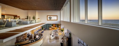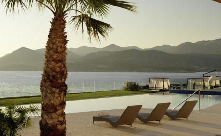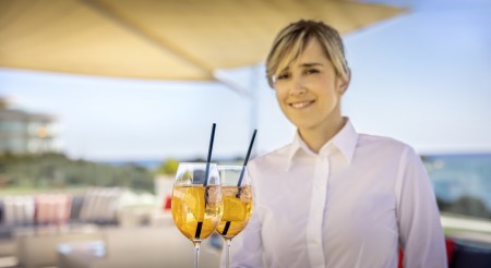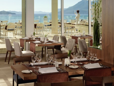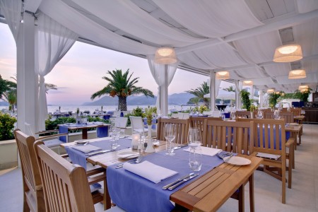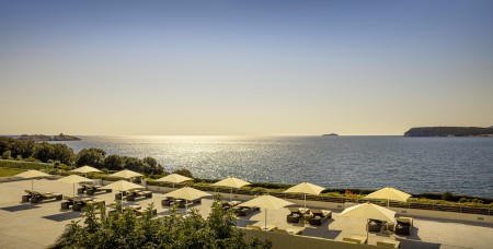 Strand: Der Kiesstrand mit Liegeflächen, Strandrestaurant, Duschen und Umkleidekabinen liegt direkt am Hotel. Sonnenschirme und Liegestühle für Hotelgäste kostenlos.