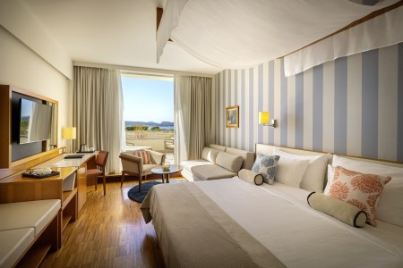 292 Zimmer: komfortabel eingerichtet mit Klimaanlage, Heizung, Telefon, WiFi-Internet (kostenlos), SAT-TV mit Interactive-TV, Minibar, Heißwasserbereiter für Tee und Kaffee, Safe, Bad oder Dusche/WC mit hochwertigen Kosmetikartikeln und Bademantel, Balkon oder Terrasse mit Meerblick.