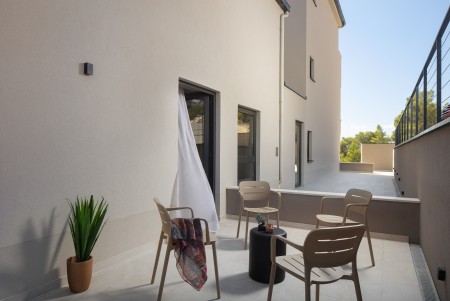 Strand: Den gepflegten Felsstrand mit Badeplateau erreichen Sie über die Küstenstraße und Stufen.