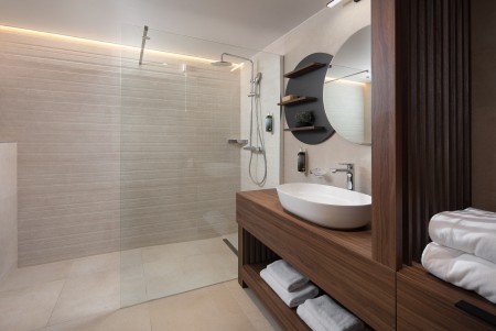 Suite Superior: ca. 32 m², Schlafzimmer mit Doppelbett, Wohnzimmer mit Ausziehsofa (160x200 cm), Balkon mit Meerblick.