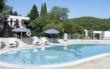 Strand: Der Fels- und Feinkiesstrand mit sandigen Abschnitten, Liegeflächen, Taverne, Pizza/Pasta-Bar und Grill-Bar ist ca. 80 m entfernt. Liegestühle und Sonnenschirme gegen Gebühr.