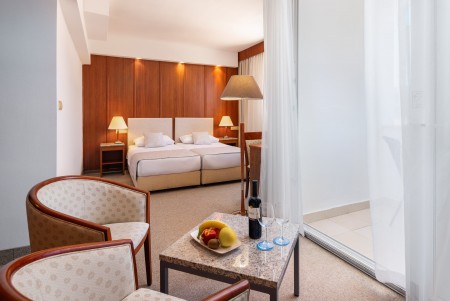 Junior Suite: ca. 34-38 m², mit Doppelbett oder zwei Einzelbetten, Wohnbereich mit zusätzlichem Schlafsofa, Balkon oder Loggia zur Parkseite.
