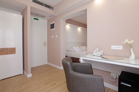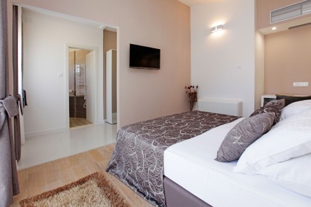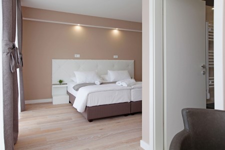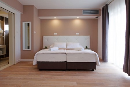 Superior Zimmer: ca. 23 m² geschmackvoll und komfortabel eingerichtet, ein großes Doppelbett, Schreibtisch, Wasserkocher mit Instant-Kaffee und Teeauswahl, Telefon, WiFi-Internet (kostenlos), Smart LED TV, Klimaanlage, Minibar, Safe, Badezimmer mit Dusche und WC, Balkon mit seitlichem Meerblick.