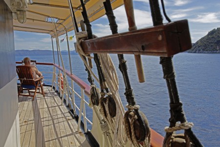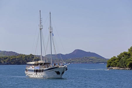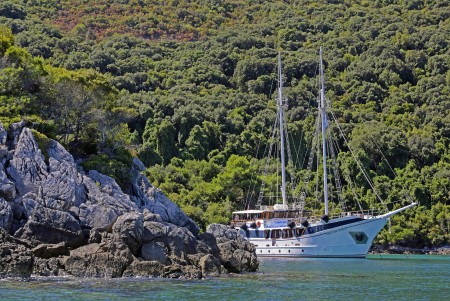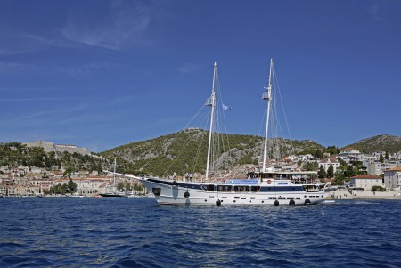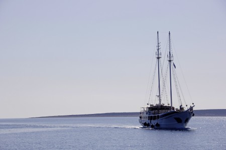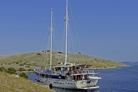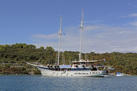 Die Kapetan Kuka – benannt nach der Roman- und Filmfigur „Captain Hook“ – ist unbestritten einer der elegantesten Motorsegler mit Stahlrumpf in der Adria. Das Schiff wird jedoch nicht von Piraten kommandiert, sondern von Kapitän Pero Kalebić von der Insel Šolta, der mit seinem kleinen Motorsegler Zelenbor viele Jahre Mitglied unserer Flotte war. Im Sommer 2015 hat sich Pero entschlossen, die Kapetan Kuka zu kaufen und mit ihr sein Comeback zu feiern. Bevor Pero zur Saison 2016 in See gestochen ist, hat er das Schiff im Winter 2015/2016 gründlich überholt, einschließlich neuer Kabineneinrichtungen und einer Badeplattform am Heck. Pero spricht übrigens gut Deutsch, denn seine Frau Sylvia kam 1981 als deutsche Urlauberin auf die Zelenbor und lebt inzwischen seit über 40 Jahren mit Pero auf der Insel Šolta.
