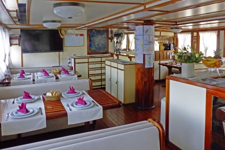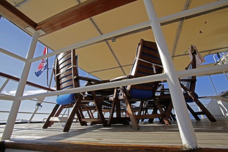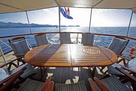 Sonstiges: Sonnendeck (150 m²) mit 16 Liegematratzen und 16 Liegestühlen, Tisch mit 10 Stühlen auf dem überdachten Teil am Heck des Oberdecks, Tische mit Bänken und Stühlen auf dem überdachten Hauptdeck hinter dem Salon für 15 bis 20 Personen, Badeplattform mit Duschen am Heck, Salon für 34 Personen mit Klimaanlage und einer kleinen Sitzecke.
