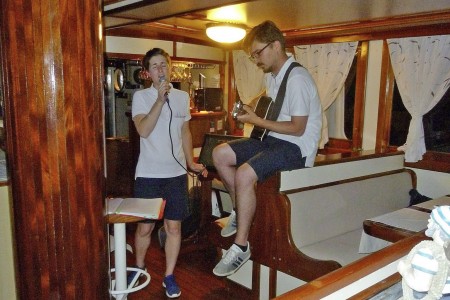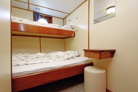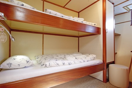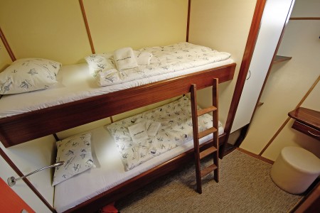 Hauptdeck: 1 Doppelkabine mit Etagenbetten, 1 Familienkabine mit Etagenbetten (= 2 Doppelkabinen mit gemeinsamer Dusche/WC, erreichbar durch einen Vorraum, der nur zu diesen beiden Kabinen gehört).