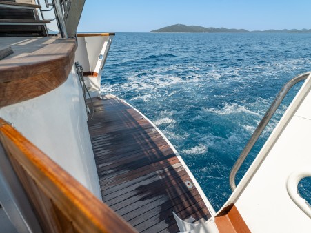 Sonstiges: Sonnendeck (200 m²) mit 16 Sonnenliegen und 10 Liegestühlen, Tische mit Bänken an Deck für 30 Personen, Badeplattform mit Duschen am Heck, Salon mit Klimaanlage für 30 Personen.