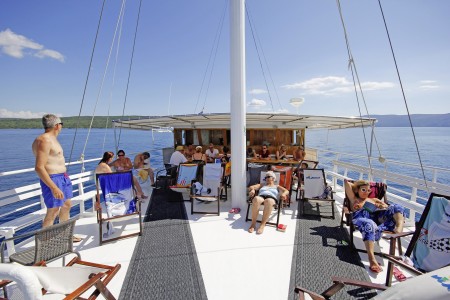 Sonstiges: Sonnendeck (150 m²) mit 20 Liegestühlen, neuer Lounge-Bereich für 10 Personen auf dem Oberdeck vor dem Steuerhaus sowie am Heck des Oberdecks für 8 Personen, Stühle und Sitzbänke an Deck, Salon mit Klimaanlage für 32 Personen.