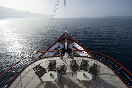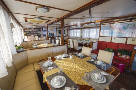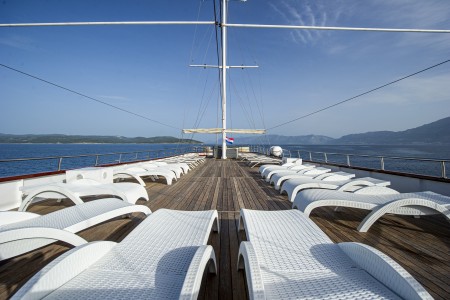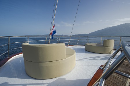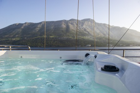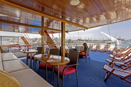 Sonstiges: Sonnendeck (280 m²) mit einziehbarem Sonnensegel, 25 Sonnenliegen, 20 Liegestühlen und Whirlpool, Tische mit Bänken hinter dem Salon auf dem Hauptdeck für etwa 20 Personen, gemütliche Sitzgruppen im Loungebereich auf dem überdachten Oberdeck, das witterungsabhängig mit Sonnenschutz oder Planen verschlossen werden kann. Badeplattform mit Duschen am Heck, Salon mit Klimaanlage für 40 Personen.