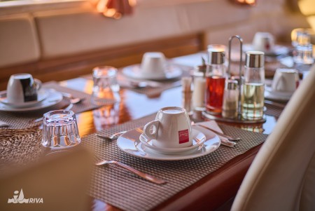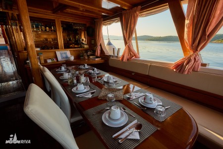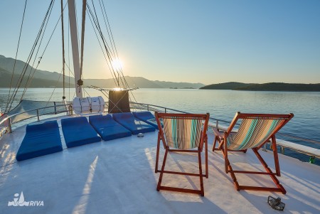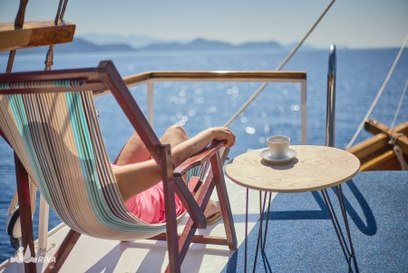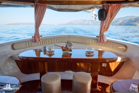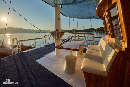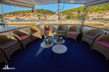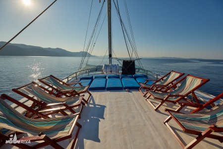 Sonstiges: Sonnendeck (70 m2) mit 10 Liegestühlen und 5 Liegematratzen, ein Tisch mit Bänken und Stühlen an Deck für 8 Personen, Sitzgelegenheiten an Deck für 20 Personen, offener Salon am Heck für 25 Personen, der mit einer Plane verschlossen werden kann und über eine Klimaanlage verfügt.