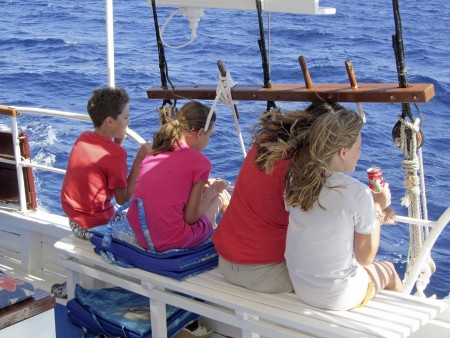 Sonstiges: Sonnendeck (200 m²) mit 16 Liegestühlen und 10 Liegematratzen, Tische mit Bänken oder Stühlen an Deck für 16 Personen (Hauptdeck) bzw. 12 Personen (Oberdeck), Badeplattform mit Duschen am Heck, Salon mit Klimaanlage für 28 Personen.