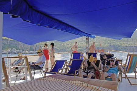Sonstiges: Sonnendeck (120 m²), 20 Liegestühle, Tische mit Bänken an Deck für 20 Personen, Salon für 32 Personen auf dem Oberdeck.