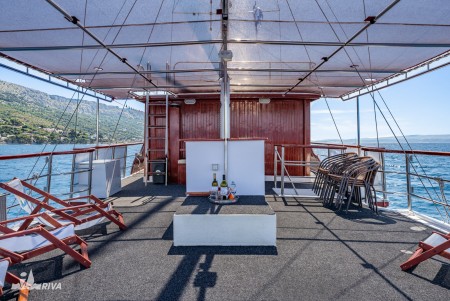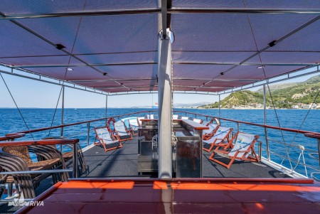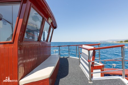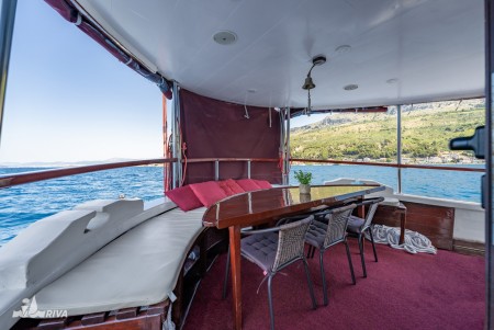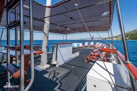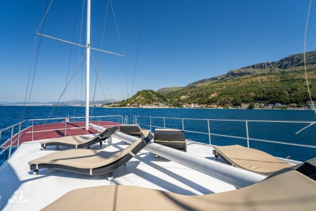 Sonstiges: Sonnendeck (100 m²) mit 14 Liegestühlen, 2 Tische mit Bänken an Deck für 18 Personen, Salon mit Klimaanlage für 26 Personen.
