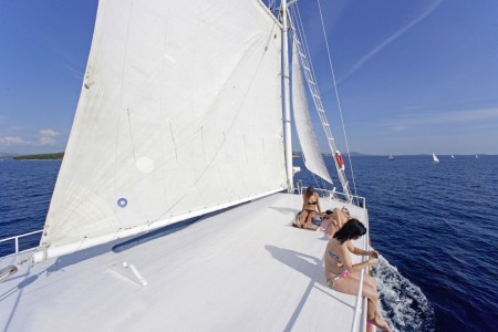 „Najlipši grad na svitu“ (die schönste Stadt der Welt) – so nennen die Bewohner von Zadar stolz ihre Stadt. Die ehemalige Hauptstadt Dalmatiens liegt auf einer Halbinsel, die von zwei Rivas gesäumt wird. Die auf der dem Festland zugekehrten Seite wird einfach nur „Riva“ genannt – hier legen die Fähren und Personenschiffe an, hier bringen die Fischer allmorgendlich ihren Fang an Land. Auf der anderen, den Inseln zugewandten Seite, liegt die „neue“ Riva – hier flaniert man auf und ab, hier treffen sich die Liebespaare zum Rendezvous, und seit ein paar Jahren kann man hier den Melodien der auf der Welt einzigartigen Meeresorgeln lauschen. Zwischen diesen Rivas liegt eine der schönsten Altstädte Dalmatiens, deren Lebensader die „Kalelarga“ ist – die autofreie Hauptstraße mit ihren Boutiquen und Cafés. Rechts und links von ihr – malerische Gassen, in denen die „Klapa“ aus reiner Lebensfreude ihre Lieder anstimmt, und prächtige historische Bauten wie die Rundkirche Sveti Donat, die Kathedrale Sveta Stošija, das Römische Forum…Kurtaxe und Hafengebühren sind in den Preisen nicht eingeschlossen und bei Einschiffung in bar an Bord zu zahlen. Diese betragen pro Person und Woche 49,– €, für Kinder bis 11,99 Jahre 24,– €.