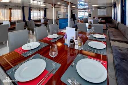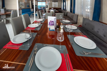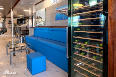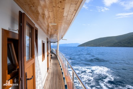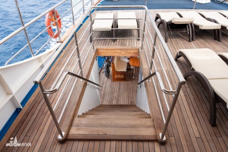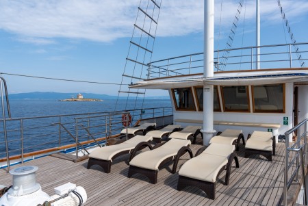 Sonstiges: Zwei Sonnendecks (insgesamt ca. 290 m²) mit 36 Sonnenliegen, einziehbaren Sonnensegeln, Tische mit Bänken und Stühlen auf dem überdachten Hauptdeck hinter dem Salon für 36 Personen, Badeplattform mit Duschen am Heck, Salon mit Klimaanlage für 36 Personen.
