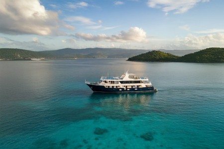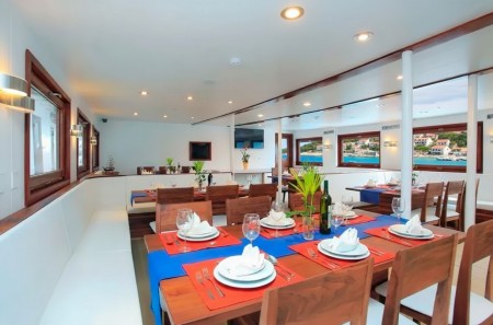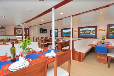 Sonstiges: Sonnendeck (150 m²) mit 30 Sonnenliegen, Badeplattform am Heck. Klimatisierter Salon für 34 Personen auf dem Oberdeck. Gemütliche Sitzbereiche.
