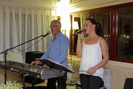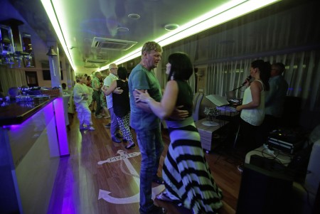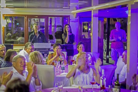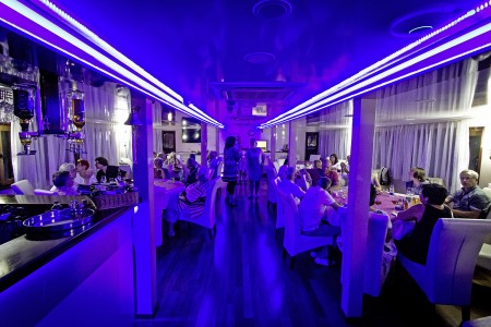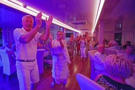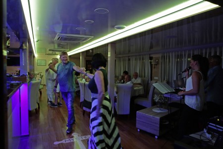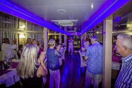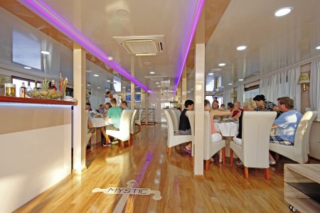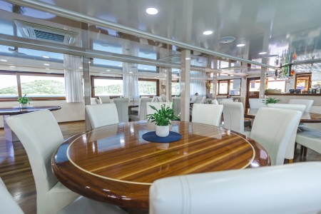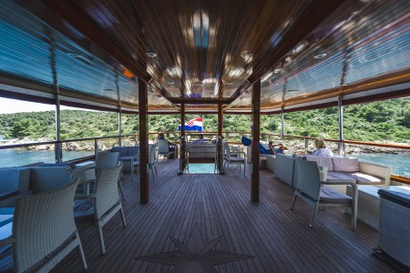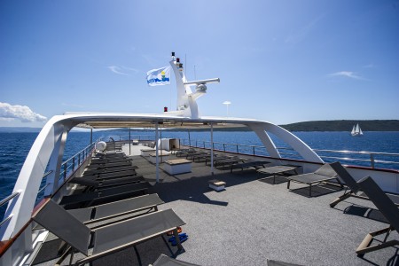 Sonstiges: Sonnendeck (220 m²) mit 36 Sonnenliegen, Badeplattform mit Duschen am Heck. Salon mit Klimaanlage für 36 Personen auf dem Oberdeck, gemütliche Sitzgruppen für etwa 20 Personen im Loungebereich auf dem überdachten Oberdeck hinter dem Salon, das witterungsabhängig mit Planen verschlossen werden kann. Tägliche Kabinenreinigung und Handtuchwechsel.