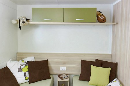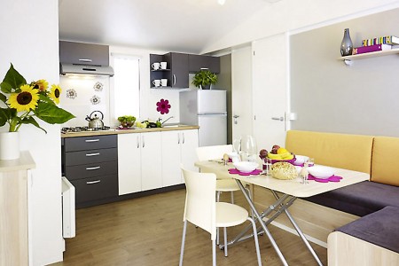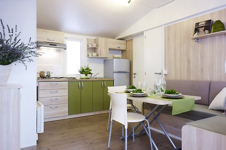 Mobilheim „M-Line" für 4-6 Personen: ca. 31 m², ein Schlafzimmer mit Doppelbett, ein Schlafzimmer mit zwei Einzelbetten. Wohn-Schlafraum mit Küchenzeile (Herd mit 4 Kochstellen, Kühlschrank mit Gefrierfach, Mikrowelle, Wasserkocher, Nespresso Maschine) und einer Schlafgelegenheit für zwei Personen, ein Badezimmer mit Dusche/WC, überdachte Terrasse (ca. 15m²) mit Sitzgarnitur. Außerdem Klimaanlage und ein Parkplatz, kein Fernseher. Die Mobilheime befinden sich in der Nähe des Fun Pools und etwa 600 m vom Kiesstrand entfernt.