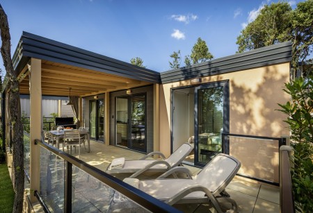 Mobilheim „Bella Vista“ für 4-6 Personen: ca. 34 m², ein Schlafzimmer mit Doppelbett, ein Schlafzimmer mit zwei Einzelbetten, zwei Badezimmer mit Dusche und WC. Wohnraum mit komplett ausgestatteter Küchenzeile (Geschirrspüler, Mikrowelle, Elektroherd, Kaffeemaschine, Kühlschrank mit Gefrierfach) und Esstisch sowie Stühlen, außerdem ausziehbare Schlafgelegenheit für zwei Kinder. Großzügige überdachte Terrasse (ca. 25 m²) mit Sitzgarnitur und zwei Sonnenliegen. Außerdem Klimaanlage, SAT-TV und Meerblick.
