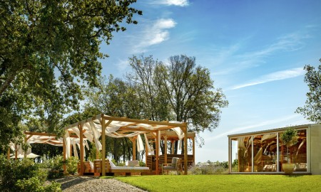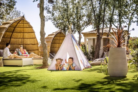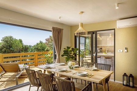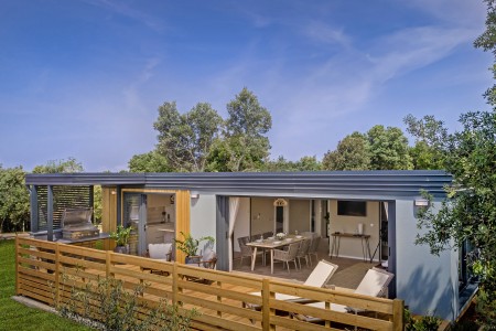 Mobilheim „Premium Exclusive Grand“ für 4-6 Personen: ca. 36 m², ein Schlafzimmer mit Doppelbett (164 x 205 cm), ein Schlafzimmer mit zwei Einzelbetten (je 84 x 205 cm), zwei Badezimmer mit Dusche und WC. Wohnraum mit komplett ausgestatteter Küchenzeile (Kochfeld, Mikrowelle, Kaffeemaschine, Wasserkocher, Kühlschrank mit Gefrierfach, Geschirrspüler) und Esstisch, sowie Stühlen, außerdem ausziehbare Schlafgelegenheit für zwei Personen. Großzügige überdachte Terrasse (ca. 25 m²) mit Sitzgarnitur und zwei Sonnenliegen. Außerdem Klimaanlage und SAT-TV.