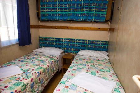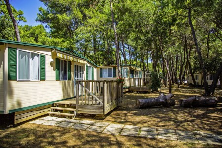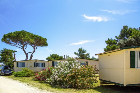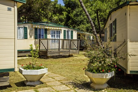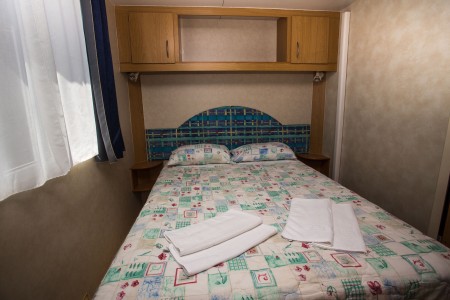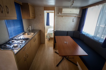 Mobilheime für 4-5 Personen: 24 m², Wohnraum mit Küchenzeile, ein Schlafzimmer mit Doppelbett (149x190 cm), ein Schlafzimmer mit zwei Einzelbetten (je 70x190 cm) und Zustellbett (65x180 cm) für 1 Kind bis 13,99 J., SAT-TV, Klimaanlage, Dusche/WC, Terrasse. Wahlweise auch buchbar zur Meerseite.
