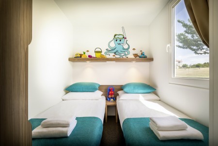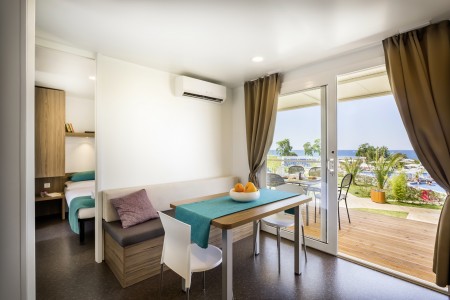 Mobilheim „Mirami Premium“ für 4-6 Personen: im „Mirami Family Village“ gelegen, ca. 32 m², komfortabel eingerichtet. Ein Doppelzimmer mit Doppelbett, ein Doppelzimmer mit zwei Einzelbetten, Wohn-Schlafraum mit Schlafgelegenheit für zwei Kinder bis 11,99 J. (120x190 cm) und komplett ausgestatteter Küchenzeile, zwei Badezimmer mit Dusche/WC, Terrasse. Außerdem WiFi-Internet (kostenlos), SAT-TV und Klimaanlage. Parkplatz neben dem autofreien Village.