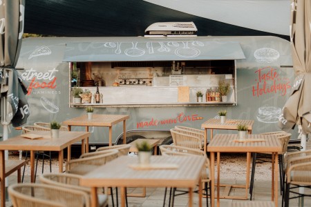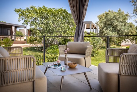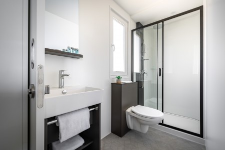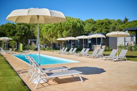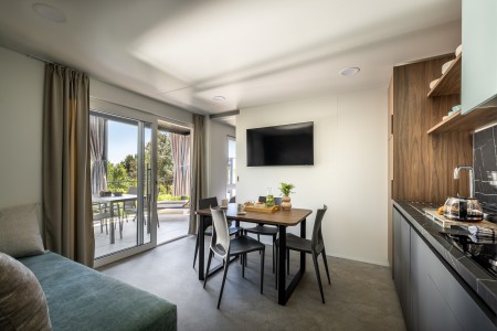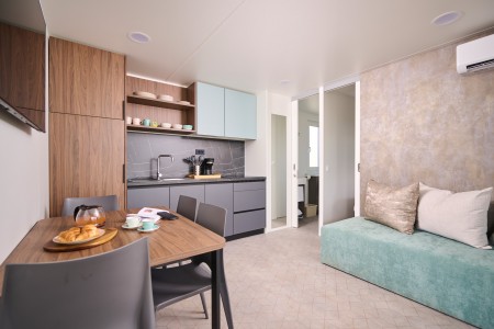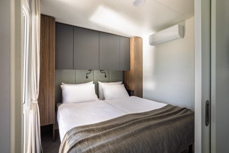 Mobilheim für 4-5 Personen „Premium“: ca. 32 m², komfortabel eingerichtet, ein Schlafzimmer mit Doppelbett (180x200 cm), ein Schlafzimmer mit zwei Einzelbetten (je 90x200 cm), Wohnraum mit Küchenzeile, Spülmaschine, Mikrowelle, Wasserkocher, Safe, Essecke und Schlafgelegenheit (Eckbank 80x190 cm) für ein Kind bis 11,99 Jahre, zwei Badezimmer mit Dusche/WC, überdachte Terrasse (ca. 25,5 m²) mit Sitzgarnitur und zwei Sonnenliegen. Außerdem WiFi-Internet (kostenlos), SAT-TV und Klimaanlage. Jedes Mobilheim verfügt über eine eigene Gartenparzelle (ca. 170 m²). Jeweils 8 Mobilheime teilen sich einen privaten Swimmingpool.