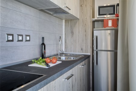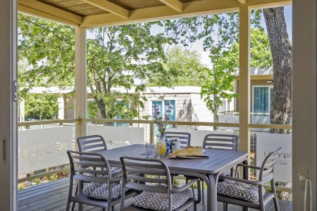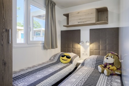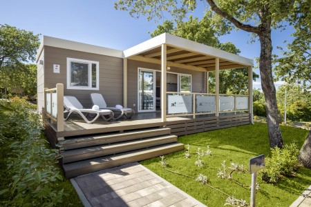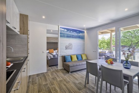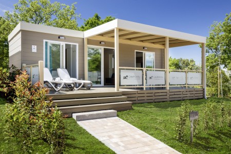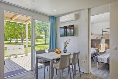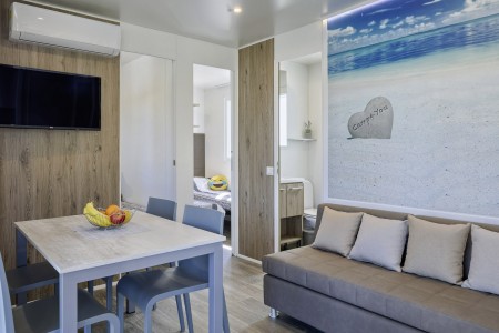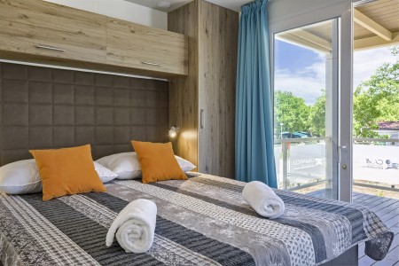 Mobilheim „Premium Family“ für 4-5 Personen: ca. 35 m², ein Schlafzimmer mit Doppelbett (160 x 200 cm), ein Schlafzimmer mit zwei Einzelbetten (je 80 x 200 cm) und zusätzlichem Hochbett für eine Person, zwei Badezimmer mit Dusche und WC, Wohn-/Essbereich mit komplett ausgestatteter Küche (kleines Kochfeld, Mikrowelle, Wasserkocher, Kaffeemaschine, Kühlschrank mit Gefrierfach, Geschirrspülmaschine), große überdachte Terrasse (ca. 26 m²) mit Sitzgarnitur und zwei Sonnenliegen. Außerdem SAT-TV, Klimaanlage, WiFi-Internet (kostenlos) und ein reservierter Parkplatz.
