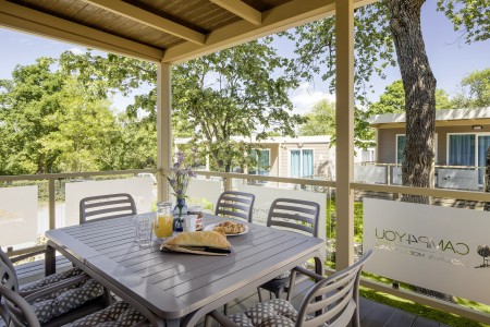 Mobilheim „Family Prestige“ für 4-6 Personen: ca. 35 m², ein Schlafzimmer mit Doppelbett (160 x 200 cm), zwei Schlafzimmer mit jeweils zwei Einzelbetten (je 80 x 200 cm), zwei Badezimmer mit Dusche und WC, Wohn-/Essbereich mit komplett ausgestatteter Küche (Kochfeld, Mikrowelle, Wasserkocher, Kaffeemaschine, Kühlschrank mit Gefrierfach, Geschirrspülmaschine), große überdachte Terrasse (ca. 26 m²) mit Sitzgarnitur und zwei Sonnenliegen. Außerdem SAT-TV, Klimaanlage, WiFi-Internet (kostenlos) und ein reservierter Parkplatz.