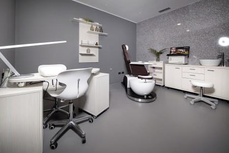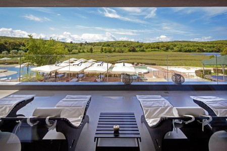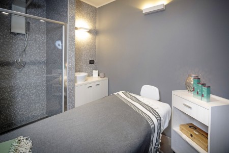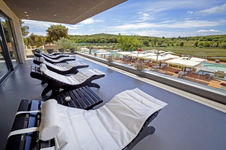Wellness-Center: Mit mehreren Saunen und speziellen Räumen für Schönheitsbehandlungen und Massagen sowie Terrasse mit Whirlpool und Liegen.