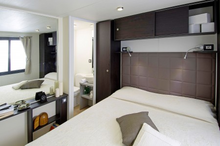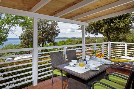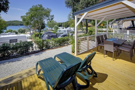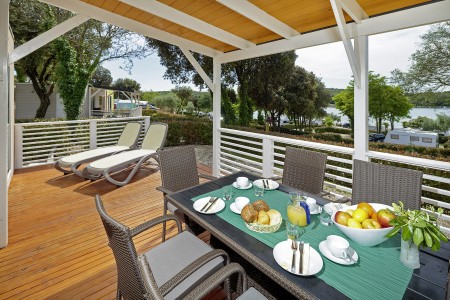 Mobilheim „Comfort" für 4-6 Personen: ca. 35 m², ein Schlafzimmer mit Doppelbett (160x200 cm), ein Schlafzimmer mit zwei Einzelbetten (jeweils 80x190 cm), zwei Badezimmer mit Dusche/WC, Klimaanlage, Safe, SAT-TV, Wohnraum mit komplett ausgestatteter Küchenzeile (Gasherd mit 4 Kochstellen, Mikrowelle, Filter-Kaffeemaschine, Geschirrspülmaschine) und Esstisch sowie ausziehbare Couch für zwei Personen, teilweise überdachte Terrasse zur Meerseite mit Sitzgruppe und zwei Liegestühlen.