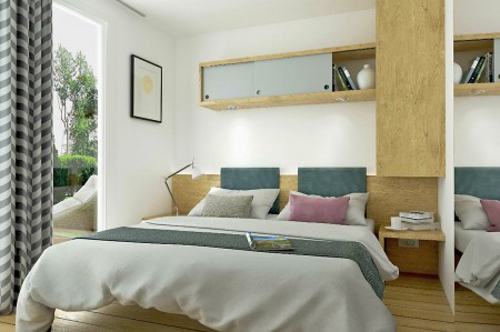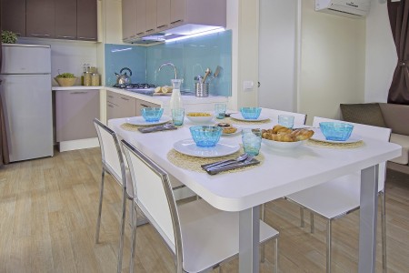 Mobilheim „Standard" für 4 Personen: ca. 30 m², ein Schlafzimmer mit Doppelbett (160x200 cm), ein Schlafzimmer mit zwei Einzelbetten (je 80x200 cm), Safe, Wohnraum mit Klimaanlage, SAT-TV, Küchenzeile mit Geschirrspülmaschine, Mikrowelle und Filter-Kaffeemaschine, Essecke, Dusche/WC, große überdachte Terrasse mit Sitzgruppe und zwei Liegestühlen.